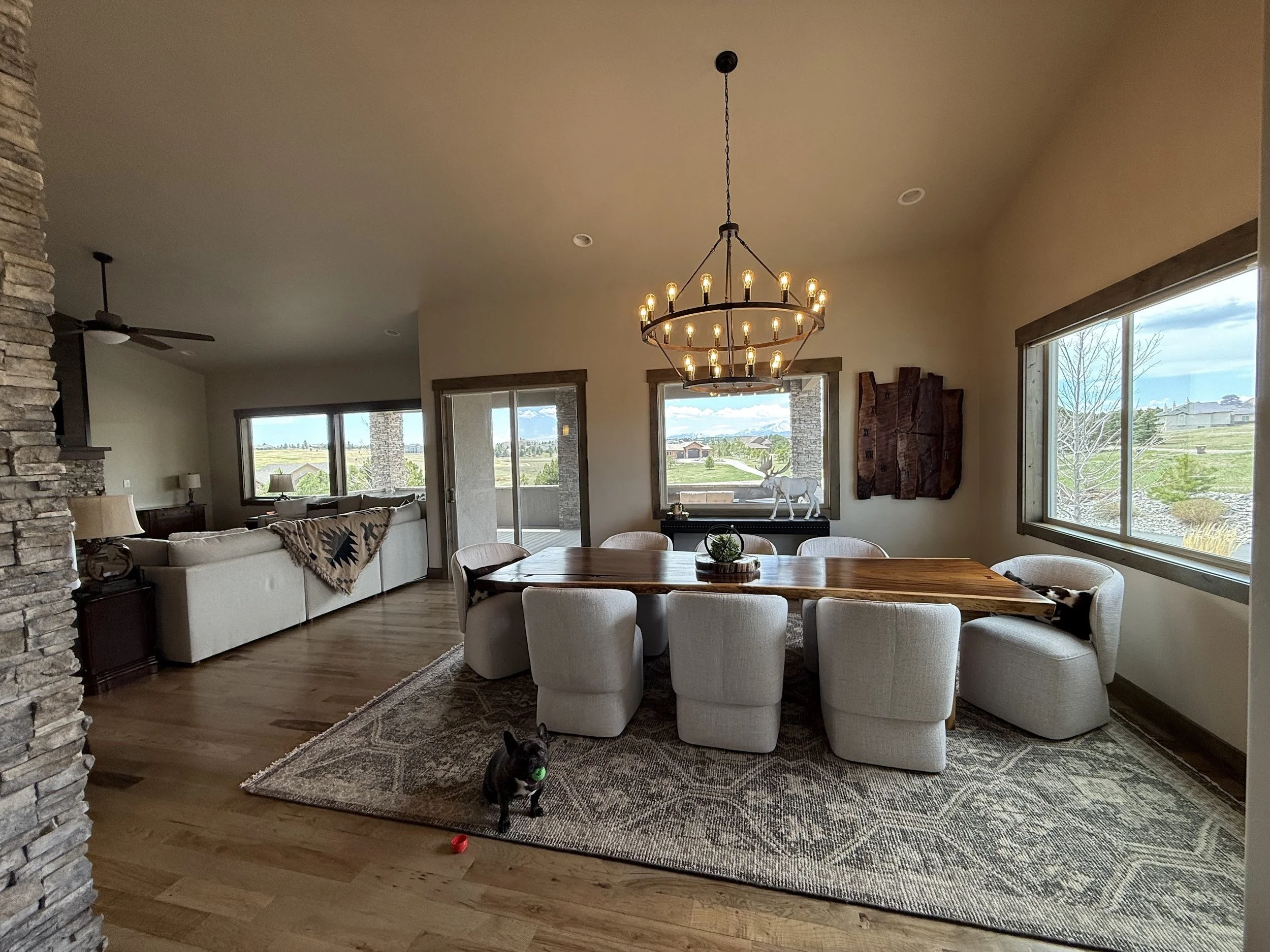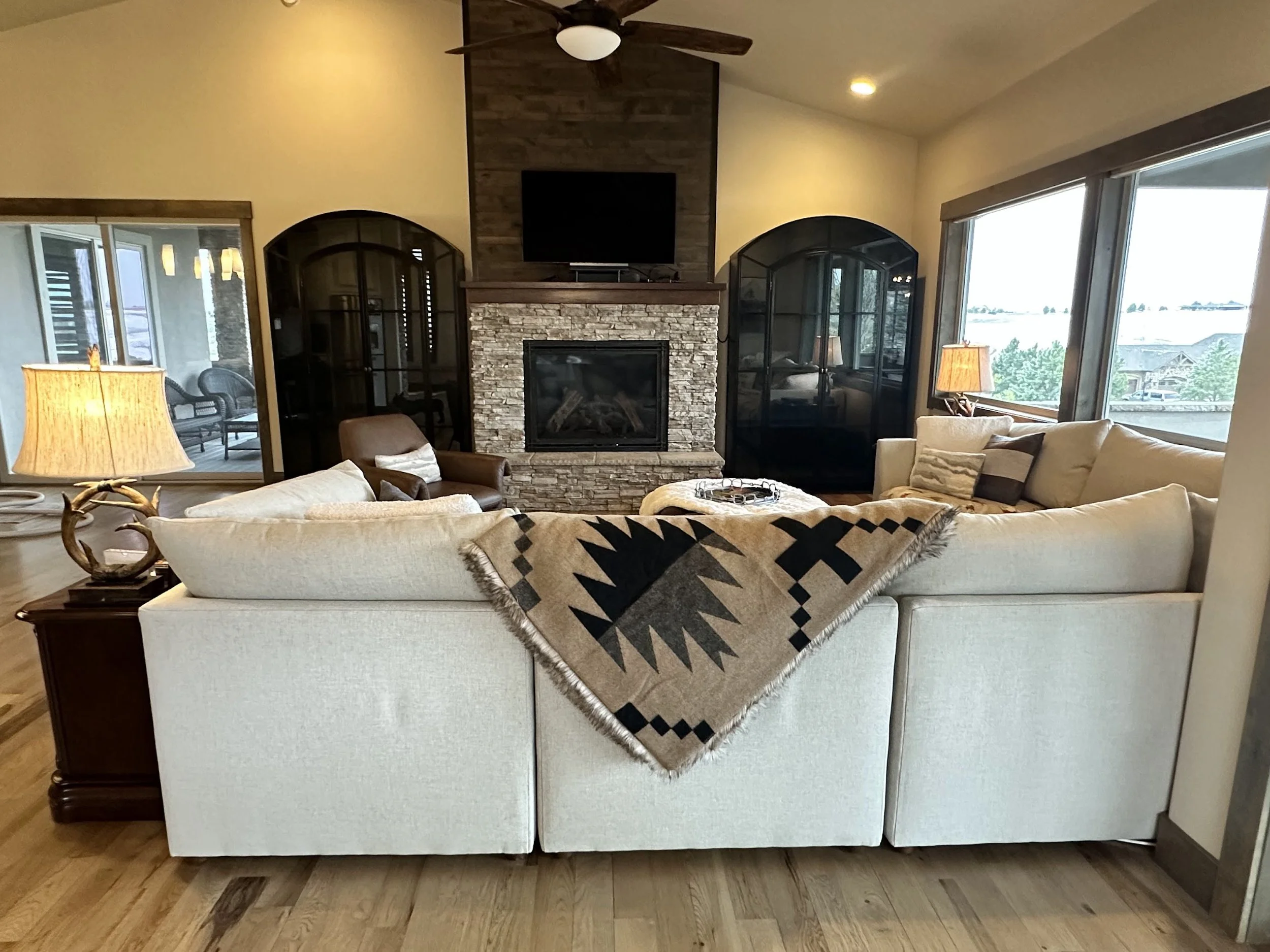 Lyonsdown LaneRemodeled the main living area, including dining chairs, rugs, bookcases, and custom millwork for the mantel and an impressive 37’ ceiling beam, creating a striking and cohesive centerpiece for the space.